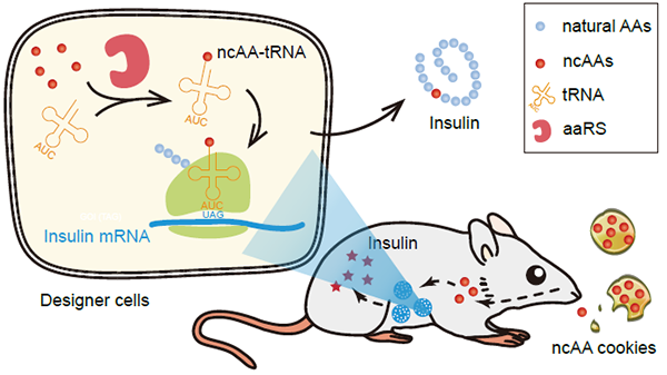 2021年11月15日,北京大学刘涛团队与鉴黄师 叶海峰团队在Nature Chemical Biology杂志发表了题为Genetic code expanded cell-based therapy for treating diabetes in mice的研究论文。文章利用基因密码子扩展技术开发了非天然氨基酸调控的胰岛素细胞治疗系统(Noncanonical Amino acids (ncAAs)-triggered Therapeutic Switch, NATS),证明了该系统能够在翻译水平快速调控蛋白质表达(图1)。该研究补充了合成生物学中的蛋白调控开关工具库,也为基因密码子扩展技术的应用创新提供了新的思路。