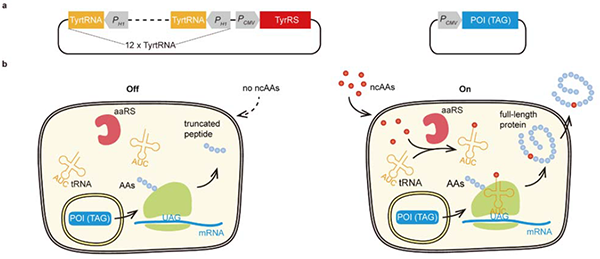 基因密码子扩展技术通过进化能够识别ncAA的氨酰tRNA合成酶和tRNA分子对,在翻译含有异位琥珀密码子的mRNA过程中将ncAA插入蛋白质。基因密码子扩展技术的最重要应用是蛋白质的定点修饰,刘涛团队则关注该技术的蛋白质翻译机制,建立了在蛋白质翻译水平调控的药物蛋白调控系统。研究人员将含有异位琥珀密码子的药物蛋白基因以及氨酰tRNA合成酶和tRNA分子对插入哺乳动物细胞基因组,构建了NATS系统细胞系(图2a)。在普通培养基中,NATS细胞的核糖体翻译到异位琥珀密码子时由于缺乏ncAA而导致翻译终止。而在含有ncAA的培养基中,NATS细胞可以利用ncAA翻译药物蛋白(图2b)。