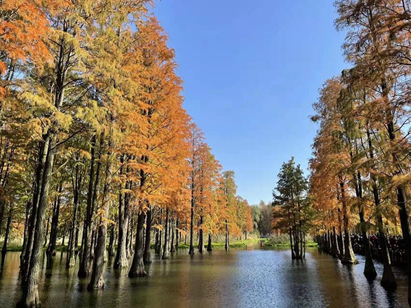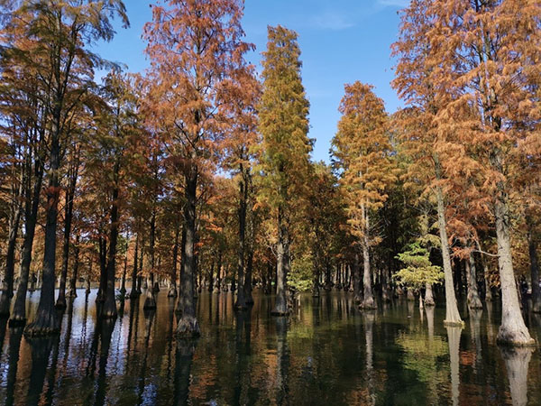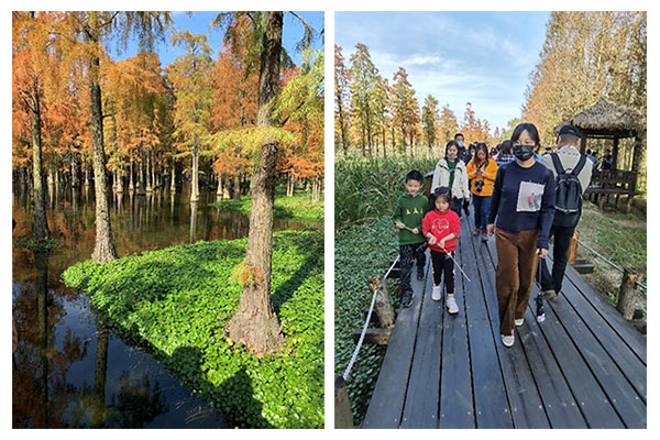午饭后,一行人抵达青西郊野公园开始第二站的自由观赏之行。响晴的秋日午后天高云淡,碧空如洗,青西郊野公园内的“水上森林”恰逢最佳观赏期,一望无际的池杉林红黄相染,林水交融,树树秋色倒影在静谧的湿地水面,光影交错间宛若一幅大自然描绘的天然油画。老师们纷纷用手中的镜头记录下这美妙的秋日景色。