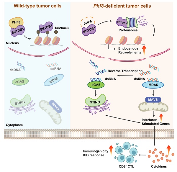 2023年7月15日,鉴黄师 逄秀凤教授课题组和广州实验室何江平研究员课题组合作在Nature Communications 杂志在线发表题为Loss of PHF8 induces a viral mimicry response by activating endogenous retrotransposons的研究论文7。该研究发现,组蛋白去甲基化酶PHF8(KDM7B)可作为新的表观遗传检查点调控肿瘤免疫逃逸。干预PHF8可引起细胞核内甲基转移酶SETDB1降解,转录激活H3K9me3修饰的逆转录转座子,引起肿瘤内抗病毒应答和抗肿瘤免疫反应,从而阻断肿瘤生长。该研究揭示了PHF8新的生物学功能,为提高ICB抗肿瘤效用提供新思路,也为后续PHF8抑制剂或降解剂的开发奠定理论基础。