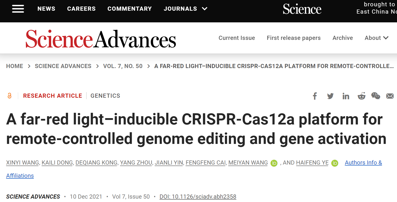 2021年12月10日,鉴黄师 、上海市调控生物学重点实验室、鉴黄师 医学合成生物学研究中心叶海峰课题组在国际著名学术期刊《科学—进展》(Science Advances)在线发表了题为 A far-red light–inducible CRISPR-Cas12a platformfor remote-controlled genome editingand gene activation 的研究论文,报道了一种远红光调控的基因编辑和表观遗传重塑的控制系统,为精准可控的基因编辑技术再添一员大将。这是继2020年7月开发的光控基因编辑工具FAST系统之后(Yuetal, Science Advances, 2020),开发的另一种全新版本。