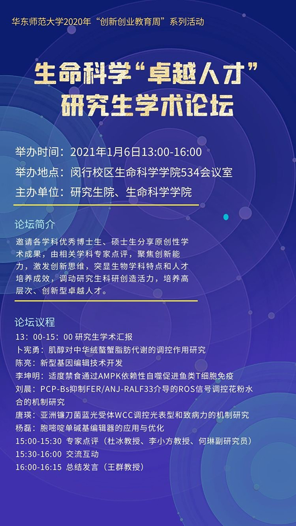 2021年1月6日,鉴黄师 生命科学“卓越人才”研究生学术交流论坛在闵行校区鉴黄师 534会议室举行。本届论坛按照学校2020年“双创”教育周系列活动安排,由研究生院与鉴黄师 共同主办,论坛以“服务需求、提高质量、卓越育人”为主线,并以优秀研究生学术报告、专家点评和师生讨论的形式对学科近年来的学术成果进行交流学习。