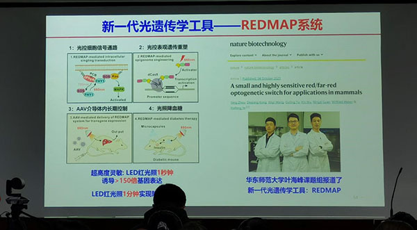 叶海峰研究员首先简述了光遗传学从无到有的发展史,并说明了光在生命活动中的重要作用。随后,他介绍了他们团队研究的远红光调控基因表达的光遗传研究技术。通过这个技术,只需要一个小小的LED灯,就可以方便地进行胰岛素调节,从而治疗糖尿病。已有用于调节激素表达的光遗传工具存在光诱导倍数低、灵敏度不高等问题,因此叶老师带领团队攻关,研发出名为“REDMAP”的新型光遗传工具,以其超高度灵敏的性能推动研究突破。最后,叶老师表示在光遗传学方面还有许多新领域、新方向等待人们去探索、研究,表达了对同学们的期待。