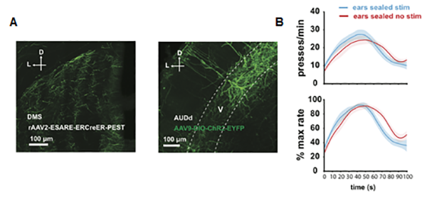 如图1所示,在最新的实验中,金鑫教授团队开发了一个新的行为范式,由动物压杆自主控制计时的开始和结束。在训练小鼠学会30秒计时后,小鼠在等待过程中会展现出自发的压杆行为,这些动作不是行为范式所要求的,也不导致任何奖赏。然而,研究团队惊奇地发现剥夺动物的听觉输入严重影响计时的准确性,而剥夺动物的视觉或触觉输入没有影响。进一步的实验发现计时所需的听觉信息来自于小鼠在等待期间自身压杆所产生的声音反馈,并且该感觉运动反馈信号由高级听觉皮层负责处理。最后,通过一系列先进的分子生物学手段,研究团队鉴定出了高级听觉皮层处理听觉反馈信号的神经元群体,并进一步展示闭环光遗传学激活该特定的神经元群体以模拟听觉反馈,可以协助听觉剥夺的小鼠恢复正常的计时功能(图2)。最后研究团队还发现,计时所需听觉信息不是纯粹的声音输入,而必须是依赖于小鼠自身动作的听觉反馈。