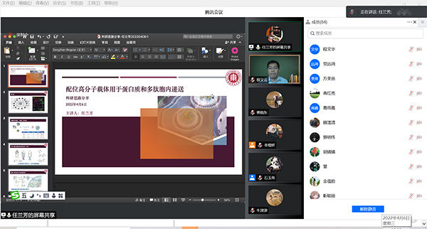 接下来,任兰芳博士以“配位高分子载体用于蛋白质和多肽胞内递送”为题,介绍了自己博士四年期间的科研经历,结合自身经历分享了一些对科研工作的思考和感悟,她认为科研与生活互相促进是最好的状态,常怀感恩之心会更有工作动力。