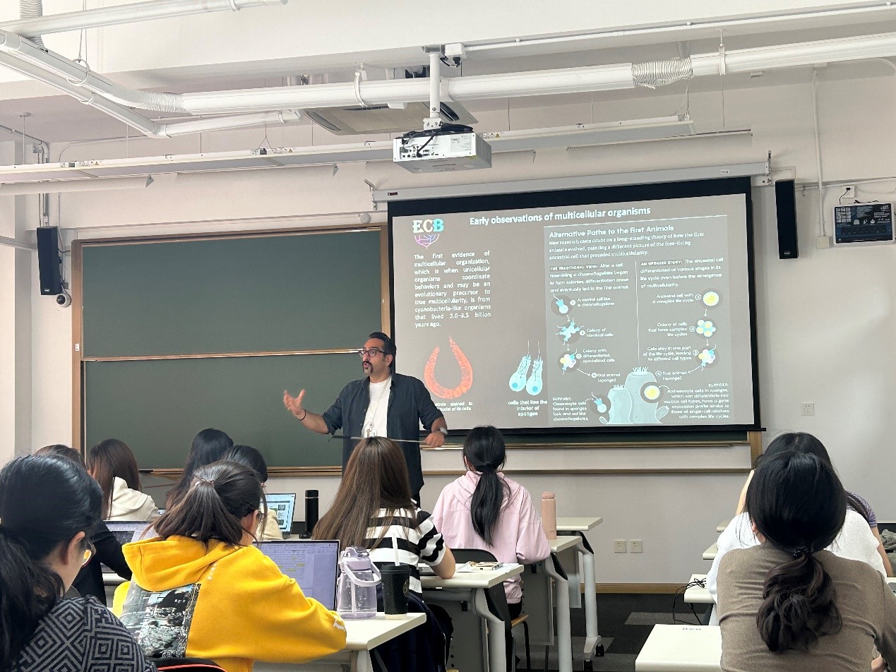 课堂上,丹尼尔老师思路清晰、内容娴熟,围绕多细胞生物科学假说展开教学,为同学们带来了一场丰富而生动的英语课程。同学们对课程的内容都表现出浓厚的兴趣,不仅对细胞学说有了更深刻的理解,也在轻松的学习氛围中得到了科学思维的训练和发展。课程结束后,每位听课教师都基于自己的听课体会,从讲课方式、课程内容组织形式、学生积极性等方面深入评析了此次公开课优缺点。丹尼尔老师清晰而流利的英文表达令各位听课教师印象深刻,同时课程内容充实,授课逻辑清晰,课程秩序良好,受到老师们的充分认可。同时,老师们也建议丹尼尔老师在进行理论内容的讲解时可以适当结合生活实例、学科研究进展等,充分激发同学们对演化细胞生物学的兴趣。此外,教学委员会也提出丹尼尔老师可以考虑引入批判性思维训练,将讲授和讨论相结合,组织学生对科学问题进行讨论,加强学生主动思考的能力。
