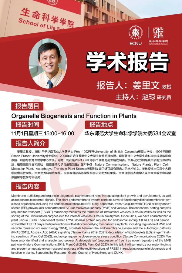 姜里文教授,1984年于华南农业大学获学士学位;1992年于University of British Columbia获硕士学位;1996年获得Simon Fraser University博士学位;2000年开始任香港中文大学生物系助理教授;现任香港中文大学鉴黄师 卓敏讲席教授、细胞与发育生物学中心主任。同时,现在是Plant Cell 等多个刊物的副主编或编委。主要研究方向是蛋白质的定位和转运、植物细胞内吞和胞吐、细胞器动力学与生物发生;在PNAS、Nature Communication、 Nature Plants、Plant Cell、Molecular Plant、Autophagy、Trends in Plant Science等期刊发表了近百篇有影响力的学术论文。姜教授多次荣获中大理学院模范教学奖、中大优秀科研成果奖、国家教育部高等学校科学研究优秀成果奖、中大理学院杰出学人及中大卓敏生命科学教授席等教学与科研奖。