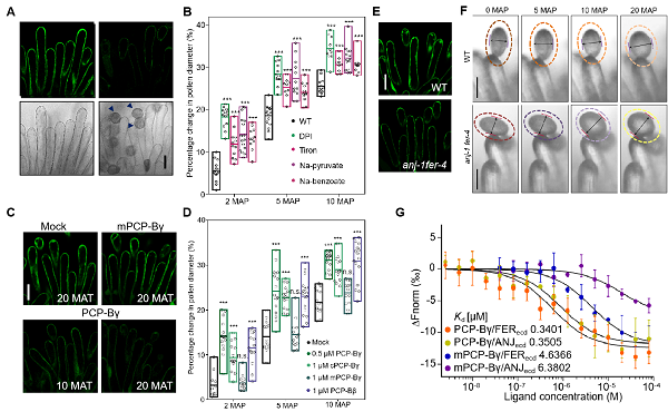 拟南芥雌蕊柱头的乳突细胞在授粉前存在活性氧的积累,而授粉引起活性氧水平下降(图1A),当对活性氧抑制剂和清除剂饲养的柱头授粉后发现,柱头活性氧水平降低促进花粉水合(图1B)。来自花粉覆盖物PCP-B小肽处理野生型柱头能够引起乳突细胞活性氧水平降低(图1C),并且经PCP-Bγ处理的柱头引起花粉水合速率加快(图1D)。柱头乳突细胞中FER和ANJ受体激酶突变后造成活性氧水平偏低(图1E)和花粉水合加快(图1F)。进一步研究发现, FER/ANJ和PCP-Bs相互作用(图1G),共同调控柱头活性氧水平和影响花粉水合。