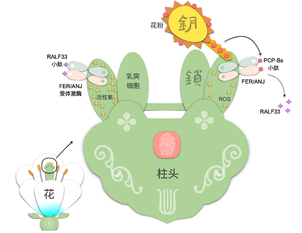 “花粉通过其覆盖物中的PCP-B小肽竞争柱头中的RALF33小肽,抑制柱头中RALF33—FER/ANJ受体激酶信号通路维持的活性氧水平,从而影响花粉水合。”李超课题组经过4年的实验研究得出结论。研究中发现的小肽、受体激酶以及信号通路成员在开花植物中广泛存在,由此推测,开花植物在进化上采用相似的策略以保证亲和花粉和柱头之间的识别。