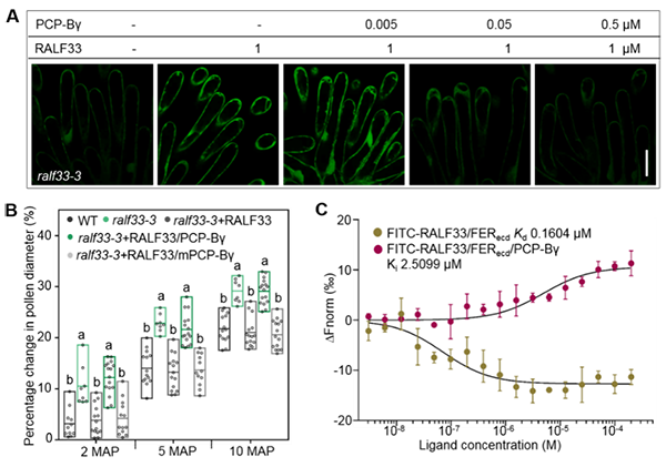 进一步还发现,柱头乳突细胞自分泌的RALF33小肽通过FER/ANJ-LLG1-ROP2-RBOHD信号通路引起活性氧产生。而PCP-Bγ小肽可以抑制RALF33小肽引起的活性氧产生(图2A),并且促进花粉在柱头的水合(图2B)。通过各种生化实验体系,发现PCP-Bγ小肽能够将FER-RALF33复合物中的RALF33小肽竞争下来,而与FER互作结合(图2C)。