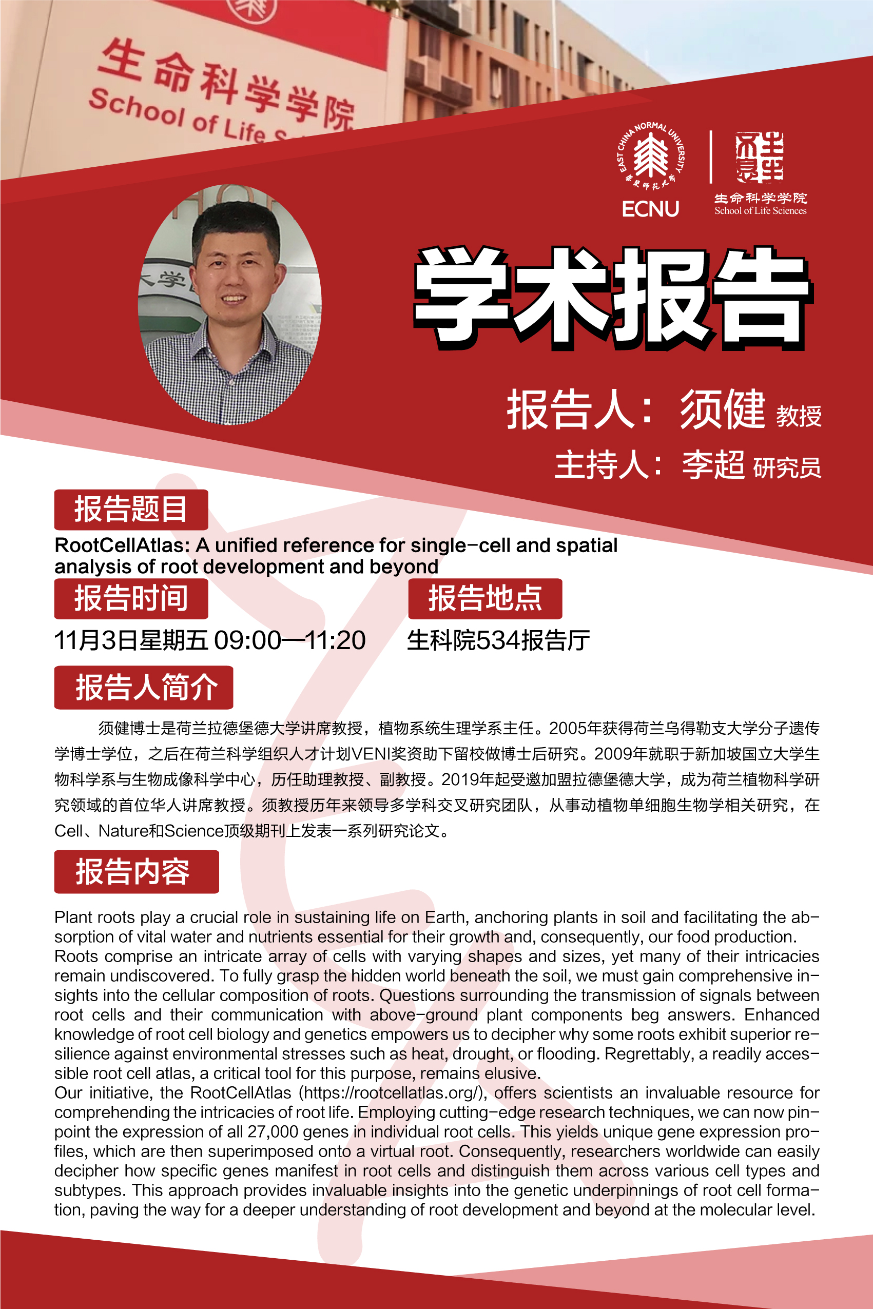 须健博士是荷兰拉德堡德大学讲席教授,植物系统生理学系主任。2005年获得荷兰乌得勒支大学分子遗传学博士学位,之后在荷兰科学组织人才计划VENI奖资助下留校做博士后研究。2009年就职于新加坡国立大学生物科学系与生物成像科学中心,历任助理教授、副教授。2019年起受邀加盟拉德堡德大学,成为荷兰植物科学研究领域的首位华人讲席教授。 须教授历年来领导多学科交叉研究团队,从事动植物单细胞生物学相关研究,在Cell、Nature和Science顶级期刊上发表一系列研究论文。