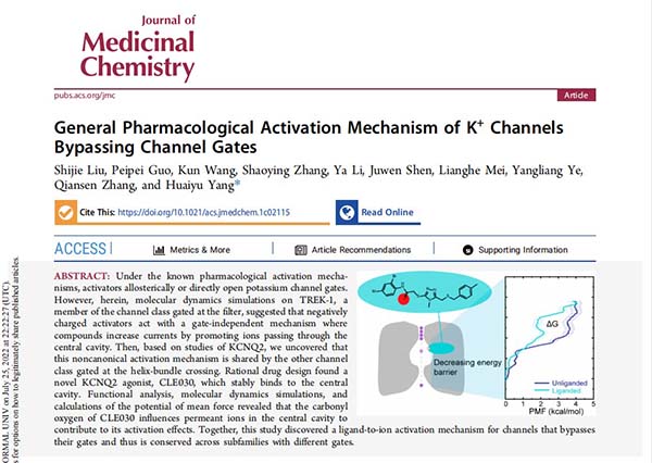 该研究成果以“General pharmacological activation mechanism of K+ channels bypassing channel gates”为题,于2022年7月25日在《Journal of Medicinal Chemistry》杂志在线发表。研究生刘诗洁、郭佩佩和王昆为论文共同第一作者,阳怀宇教授为通讯作者。中科苏州药物研究院和苏州阿尔脉生物科技有限公司参与该研究工作。