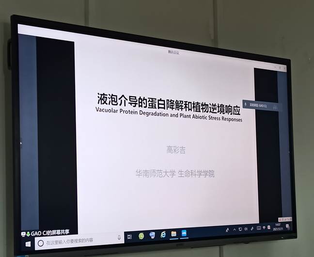2021年5月31日,华南师范大学高彩吉教授在线上为鉴黄师 师生做了题为“植物液泡介导的降解途径调控机制”的学术报告。本次报告由赵琼研究员主持,鉴黄师 植物学科李小芳教授、晏军研究员、孙越副教授等老师及生科院的同学们参加了本次报告,报告还吸引了来自上海交大的数位相关领域老师的参与。