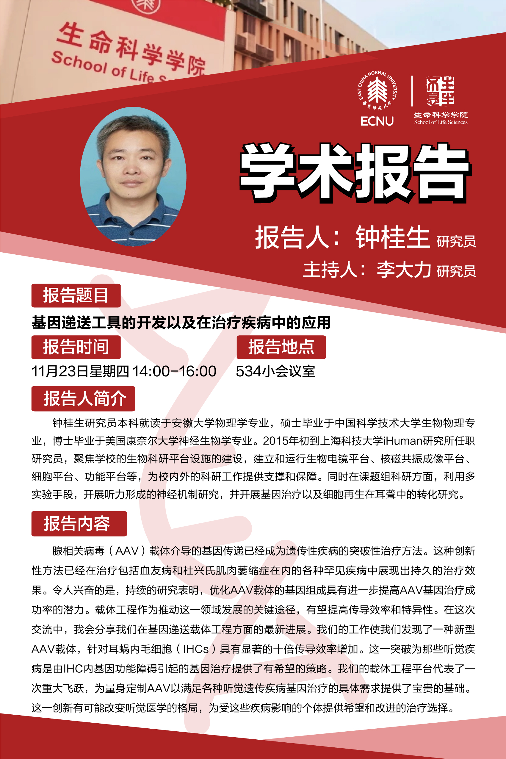 报告题目:基因递送工具的开发以及在治疗疾病中的应用