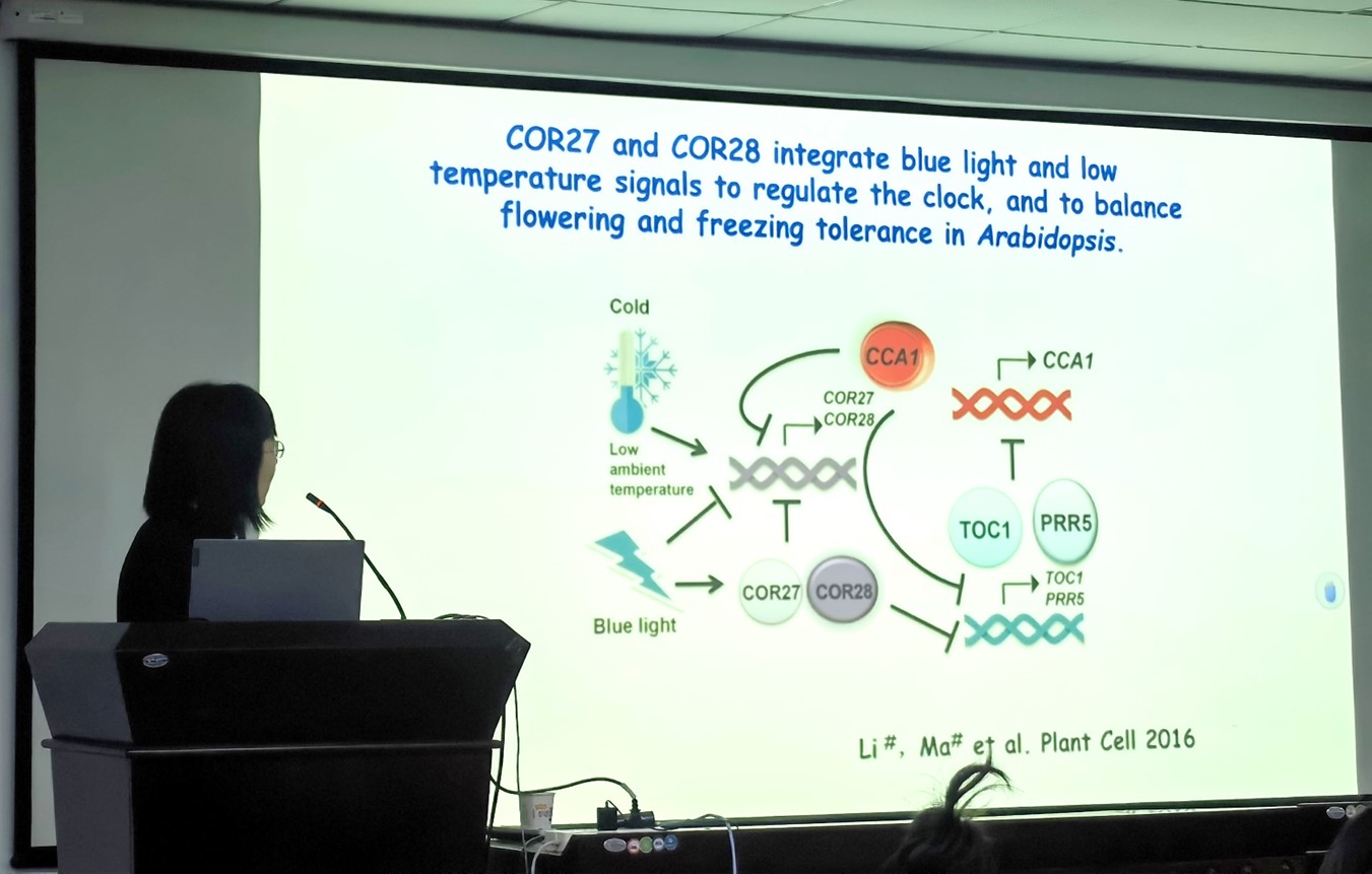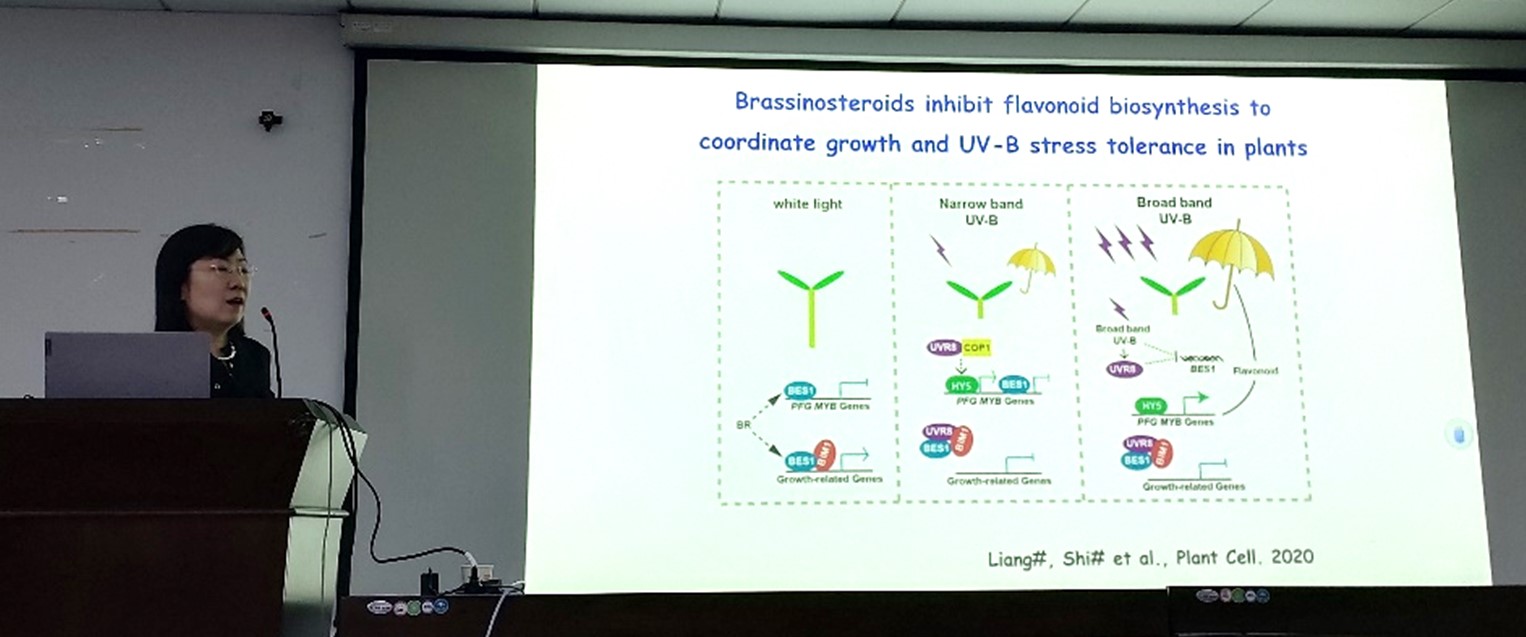 刘老师还详细介绍了紫外光UV-B信号通路的相关研究。植物通过紫外光受体UVR8,与WRKY36互相作用,间接促进HY5的转录,以调节细胞的伸长;UVR8抑制生长素响应转录因子MYB73/MYB77协同光和生长素信号调控地上和地下部分的发育。同时,紫外光还可以诱导植物产生黄酮类的次生代谢物来 “防晒”,这个机理可以用于药用植物次生代谢物的合成。关于紫外光调节植物发育刘老师总结道,植物是非常聪明的,当没有紫外的时候促进伸长,同时为了节约能量抑制次生代谢物的合成;当紫外较弱时,植物会停止伸长,但此时还不需要合成“防晒霜”;当紫外增强时,植物会抑制BES1的表达,大量诱导次生代谢物的合成,用来防晒。