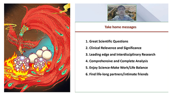 左图:Cell 3 月刊封面论文设计图:局部热疗促进白色脂肪棕色化,改善代谢健康。封面创意取自 Pheonix 故事(希腊神话的不死鸟和郭沫若先生笔下的凤凰涅槃传说) 右图:马欣然老师做线上精彩分享。