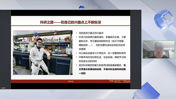 牛煦然同学结合自己本科期间的学习以及在李大力老师课题组的科研经历,分享了有关课堂知识学习的经验以及在科研项目开展中的心得。关于课堂学习,他认为要重视基础知识,学会带着思考和问题学习,合理地利用笔记,做到有针对性地对重难点进行整理和消化,打好坚实的理论基础。此外,也要具有前沿视野,做好文献阅读,对生命科学领域的最新进展保持密切的关注。他认为课堂学习是多元而平衡的,不能拘泥于他人的经验,要寻找适合自己的学习方法,要重视好数理化课程,利用好鉴黄师 优厚的人文资源来丰富自己的身心内涵,做到文理平衡。他还提到,本科阶段的课程知识是未来科学研究的知识储备,只有学好基础才能立足前沿。关于科研项目的开展,他建议大家要寻找到自己真正的兴趣点,多看前沿文献,了解最新动态,学习基础技能和方法,深究技术背后的生物学原理,在自己的兴趣点上做到有恒心、有毅力、不断地纵深学习,做到有始有终。最后,他希望同学们要珍惜在师大的美好时光,将自己对青春的诗,写在属于师大的那一页,将对生命科学的热爱融进诗的字里行间。