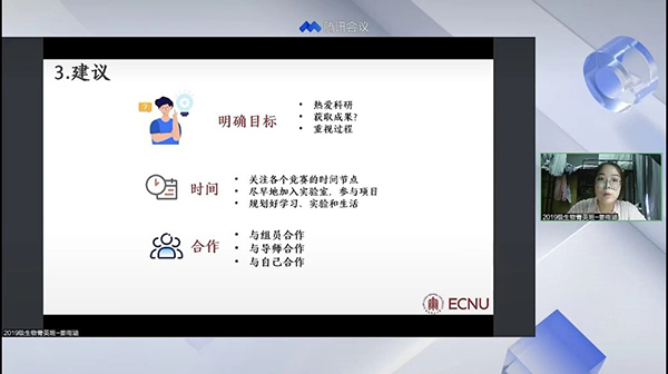 姜雨涵同学向拔尖基地的同学们分享了自己在科创上的经历、所获得的收获与感悟以及对学弟学妹们的一些建议。她认为,科创经历所能带来的不仅仅是保研数字的加分,更重要的是对自己在文献阅读检索、辩证思维、科学探究、交流沟通能力和素养上的历练,这是一个不断磨砺自己心态和意志,使自己终身受益的学习过程。她建议同学们要明确目标,做到过程导向而非结果导向,重视科研过程的学习积累;要珍惜时间,关注各个竞赛的时间节点,尽早地加入实验室参与项目,规划好学习、实验和生活;要学会交流合作,提高与导师、师兄师姐和组员们的沟通交流能力,也要学会与自己合作,调节好自己的情绪,做到胜不骄败不馁,保持平稳的心态,在科研道路上不断地勇毅前行。