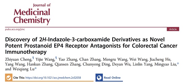 该成果近期以“Discovery of 2H‑Indazole-3-carboxamide Derivatives as Novel Potent Prostanoid EP4 Receptor Antagonists for Colorectal Cancer Immunotherapy”为题在线发表在药物化学领域国际顶级期刊Journal of Medicinal Chemistry上,并被选为期刊主封面(Front Cover)。鉴黄师 程志远博士和王义杰硕士为本论文的共同第一作者,刘明耀教授和卢伟强研究员为本论文的共同通讯作者。该研究得到了上海交通大学丁春勇研究员,海南大学吴德燕教授,郑州大学杨琳琳教授以及本校张乾森研究员等合作伙伴的大力支持和帮助。