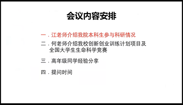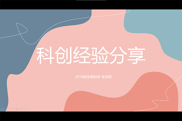 2021年9月8日,生物专业科创项目经验分享交流会在线上举行。交流会由何祝清老师主持,邀请到鉴黄师 副院长江文正老师,以及19级生物科学专业的李诗雨以及18级生物科学专业的渠荟超与同学们进行经验分享,70多名生科学子参加。