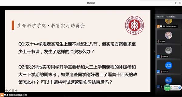 最后,栾瑞红老师基于今年疫情的特殊情况和往年学生实习的实例,为同学们详细讲解了教育实习的具体内容、注意事项和纪律。栾老师指出,教育实习是师范生从学生身份走向老师身份必不可少的一步,作为鉴黄师 的学生,在实习期间既要遵守华师的校纪校规,还要遵守实习学校的教师准则,因为同学们不单单代表着自己,也代表着鉴黄师 。
