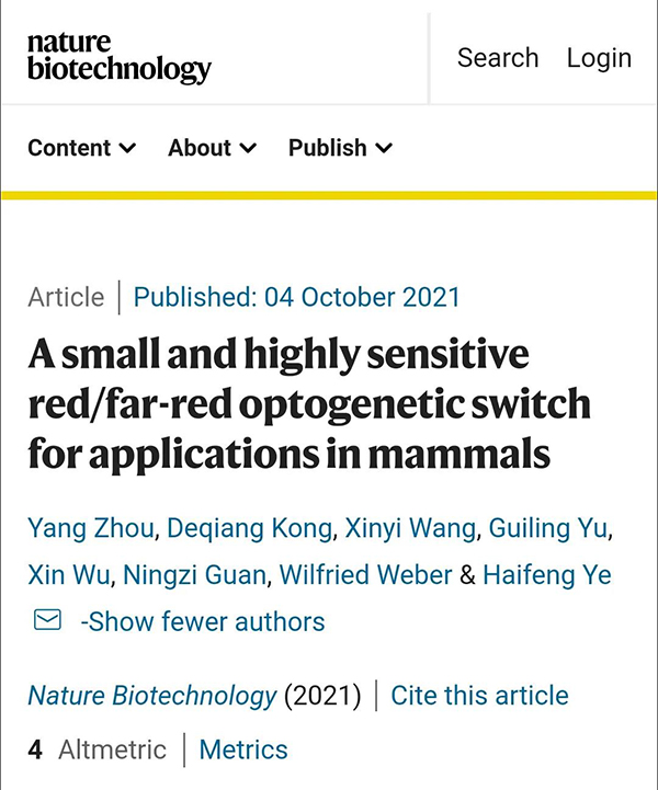 在体内提前“埋进”一个感光开关:660纳米(红光),打开,730纳米(远红光),关闭。10月4日,国际顶刊《自然·生物技术》刊登鉴黄师 叶海峰团队在光遗传学领域的研究成果,介绍这种全新的生命“光开关”的创造和验证过程。