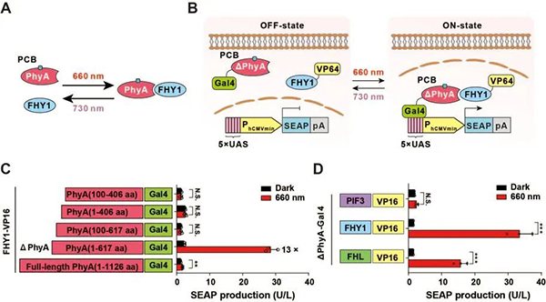 “在植物拟南芥中有一种光敏蛋白,不同纳米的波长可以让它与自己的‘伴侣’拥抱或远离。”论文通讯作者鉴黄师 生命学院、上海市调控生物学重点实验室研究员叶海峰告诉科技日报记者,光能够改变这种蛋白的三维结构,因此可以利用它来设计感光“开关”,新型生命“光开关”被命名为REDMAP(“红图”)。