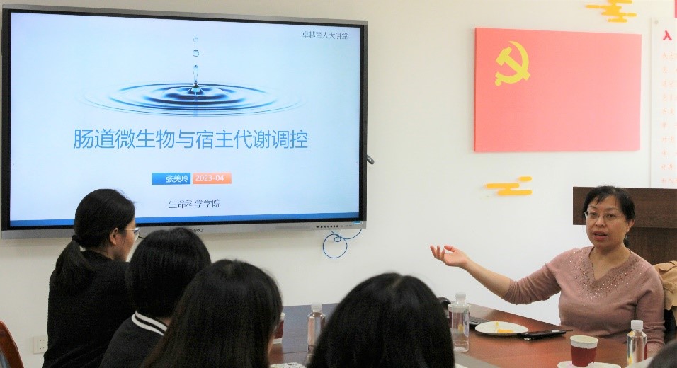 接下来,张美玲教授介绍课题组在“肠道微生物与宿主营养代谢调控”方面的科研成果,并分享了自己与学生一起成长的故事。从人类肠道微生物研究到鱼肠道微生物研究的转变,是机遇亦是挑战!尽管多方艰难,但在张教授及其实验团队的努力下,她们取得了令人瞩目的战绩。张教授言辞恳切地叮嘱道:“在学习和工作中,我们需要不断调整以适应环境并取得更大的进步。”有些改变无可避免,我们要勇敢走出舒适圈,与导师、学院、学校和社会共进退,共同谋求更好的发展。张教授还以亲身见闻为例启发并警示大家,她说:“不要把我们拥有的良好资源当成人人都触手可得的稀松平常的事物,不要将我们现在的优势变成羁绊。我们要敢于拿出‘破釜沉后’的决心和勇气,居安思危、迎难而上、终身学习!”