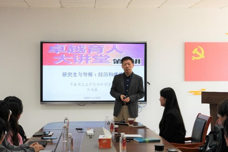 紧接着,朱瑞良教授分享了作为研究生导师的经历与感悟。他认为个人的成长与父母、环境和导师三者密切相关。朱教授提到:“作为一名研究生的职责更多是开辟与探索,而导师便是引领我们走向正确道路的风向标!同时提出了四个育人的关键词——“机遇”、“认知”、“选择”和“努力”,当其中任何一环的欠缺都有可能导致背道而驰的结果。最后朱教授鼓励道:“作为青年,最大的优势便是精力丰沛,青年学者应该铆足劲,努力探索与发掘更多未知,解决更多科学问题!”