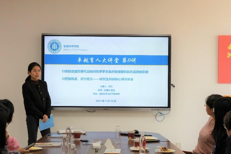稍作休憩之后,第11讲如期进行。国奖获得者张乐硕士向我们分享了她的研究课题和在读研期间的心得与体会。从尼罗罗非鱼的养殖现状引出寻找可替代豆粕的蛋白源的必要性,通过实验结果向大家展示了黄粉虫蛋白替代豆粕养殖罗非鱼的可能性及其对罗非鱼肝肠健康和肉质的影响。而谈到她在读研期间的心得和体会,她说:“科研学习之余,综合素养的提升与锻炼也不可荒废。”我们应该尽早明确自己的职业规划,并在日常中为其打下基础。最后,张乐呼吁大家——要把握机遇,尽力而为!