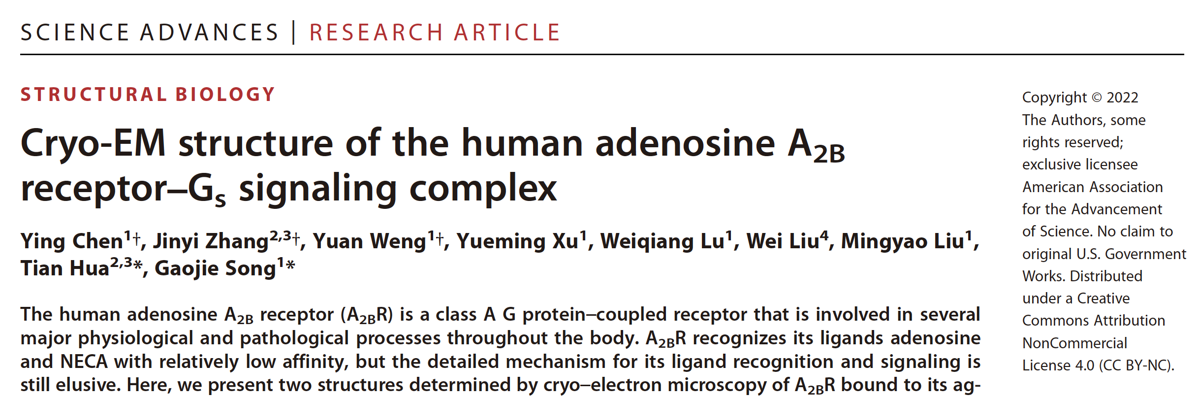宋高洁实验室联合上海科技大学华甜团队首次解析出了激活态腺苷受体A2BR与Gs异源三聚体蛋白复合物的冷冻电镜结构。这项成果以“Cryo-EM structure of the human adenosine A2Breceptor-Gs signaling complex”为题,12月24日在线发表于Science Advances期刊。
