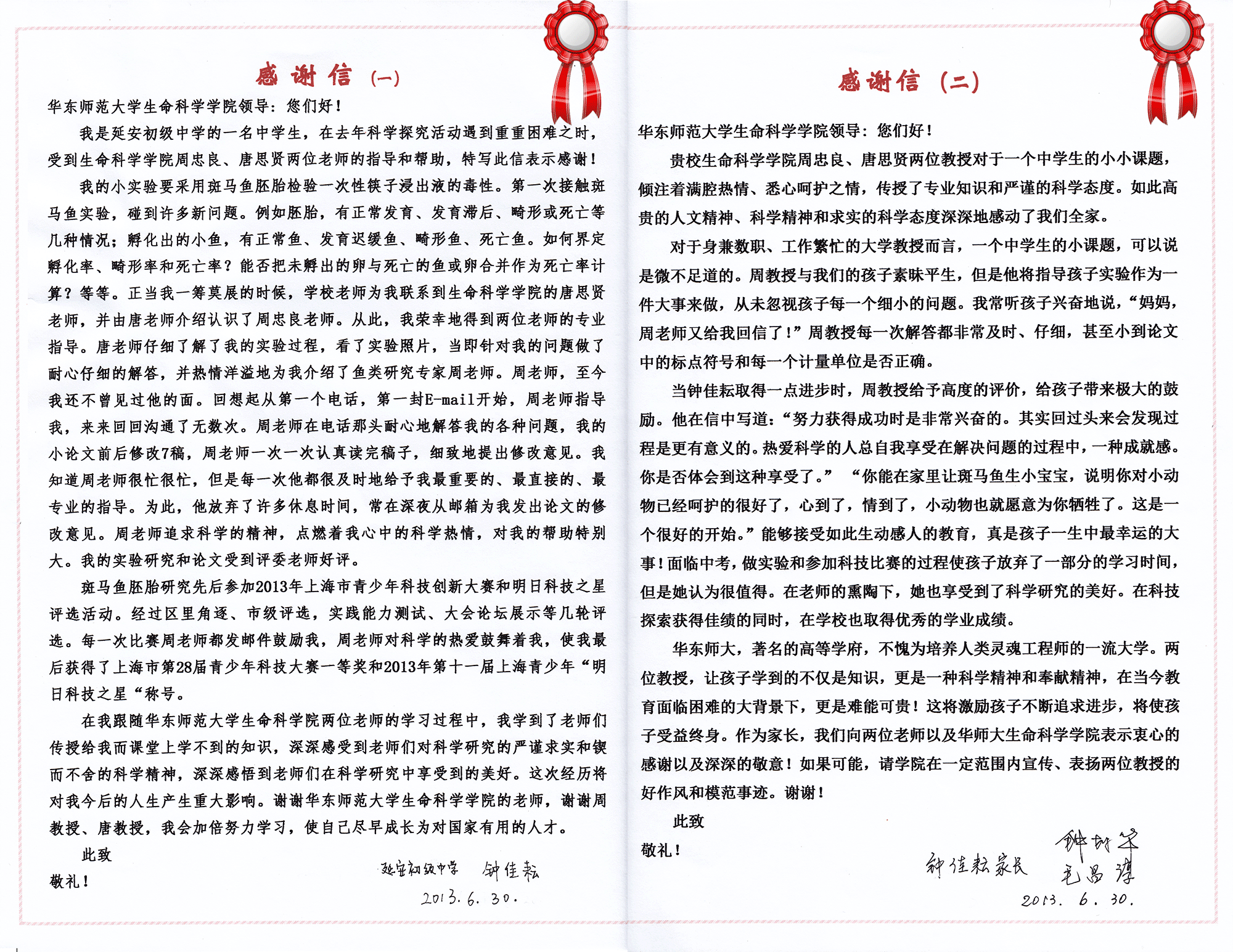 鉴黄师 周忠良、唐思贤老师收到延安初级中学学生和家长的感谢信