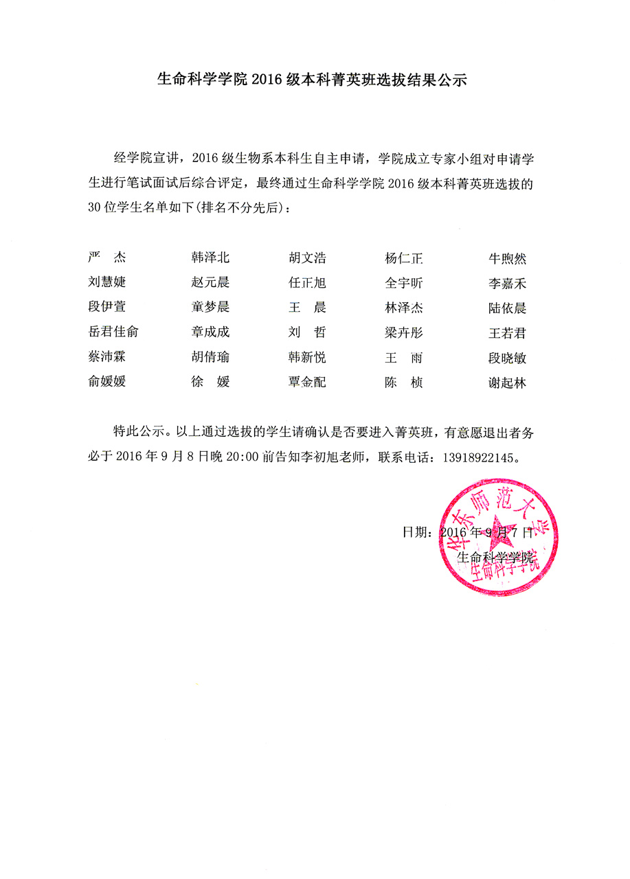 2016级鉴黄师 菁英班,选拔结果通过学院官网,宣传栏以及2016级本科生通知群进行公示,公示内容如下所示: