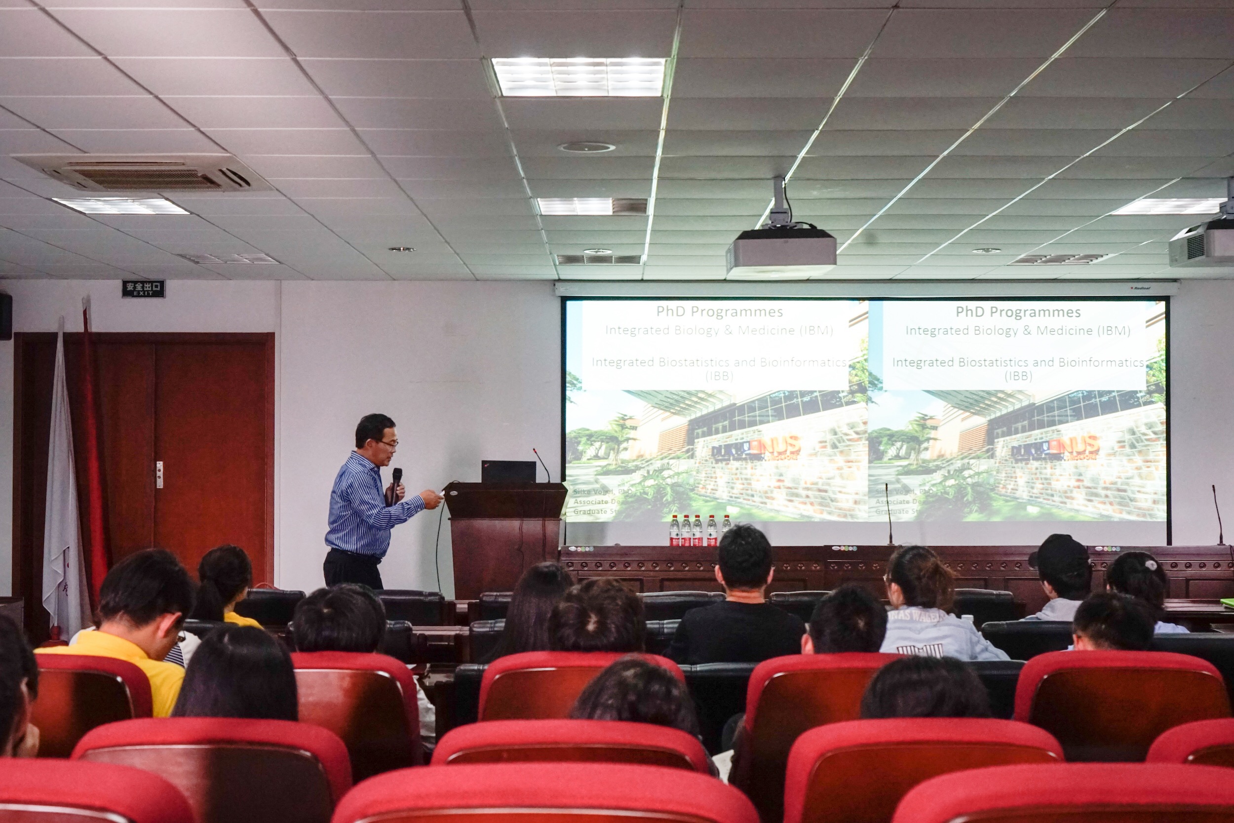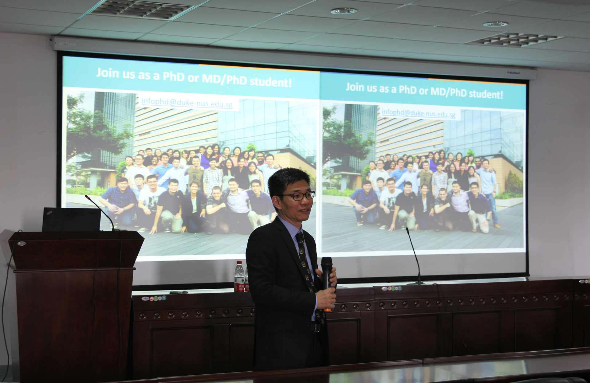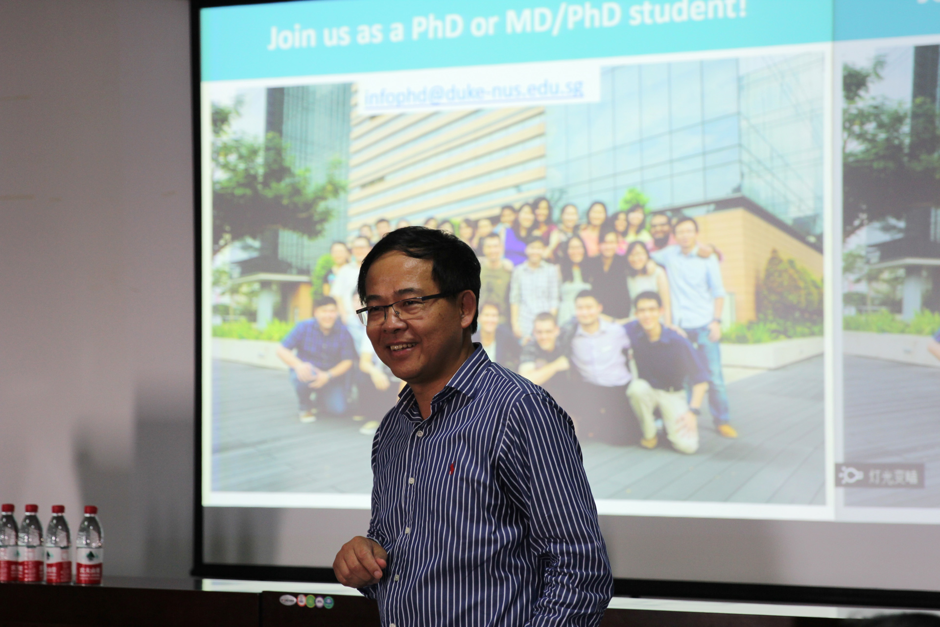 82届的杰出毕业生,现任新加坡Duke-NUS医学院教授,新生感染性疾病研究所所长的王林发院士热情洋溢地和我们分享了他在国外多年来的留学以及研究经历,并以自己在Duke-NUS医学院中的实验室为例,介绍了这所学校的师资力量和办学条件。他着重介绍了现在杜克-新加坡国立大学医学院的两个MD和PhD项目——IBM(Integrated Biology and Medical)和IBB(Integrated Bio-statistics and Bio-informatics)前者的项目在攻读结束后即可获得生物和医学的双学位,而后者更是新加坡一个新兴的生命医学科学计划的产物。在当前生物统计及数据分析方面的人才供不应求的时代,这个专业的开设很有利于学生的后续发展。在演讲最后,王院士也向我们发出了邀请函,以自己优秀的学生——鉴黄师
