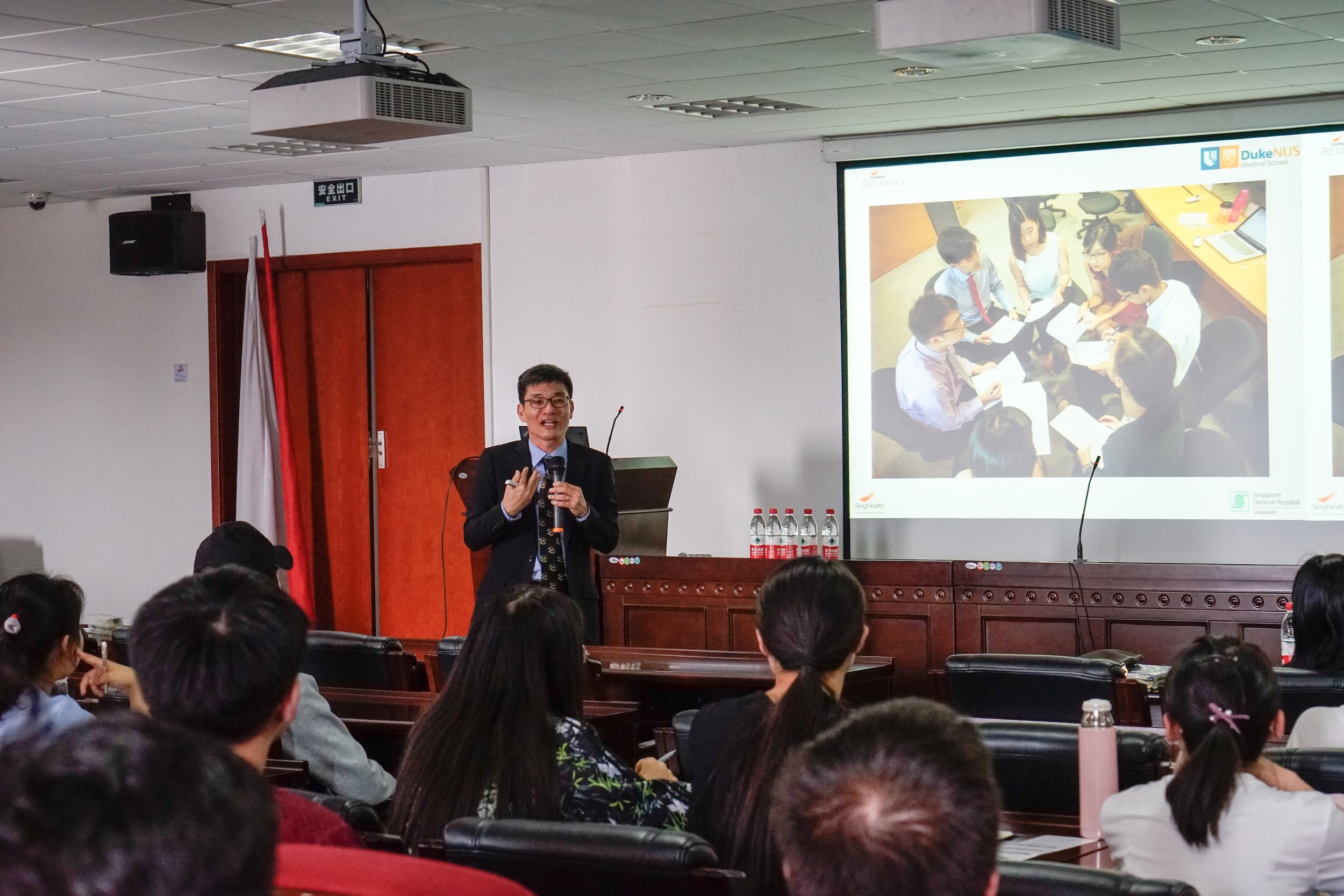 学生做了关于杜克-新加坡国立大学医学院的医学硕士及博士学位课程的介绍和招生宣传。整个报告厅座无虚席,不仅有硕士、博士生,还有包括菁英班同学在内的对出国留学十分感兴趣的本科生同学们。整个宣讲会氛围轻松愉快,在各位教授的宣讲下,同学们也对出国修读医学MD及PhD的流程和需要准备的材料等有了更为细致的了解。