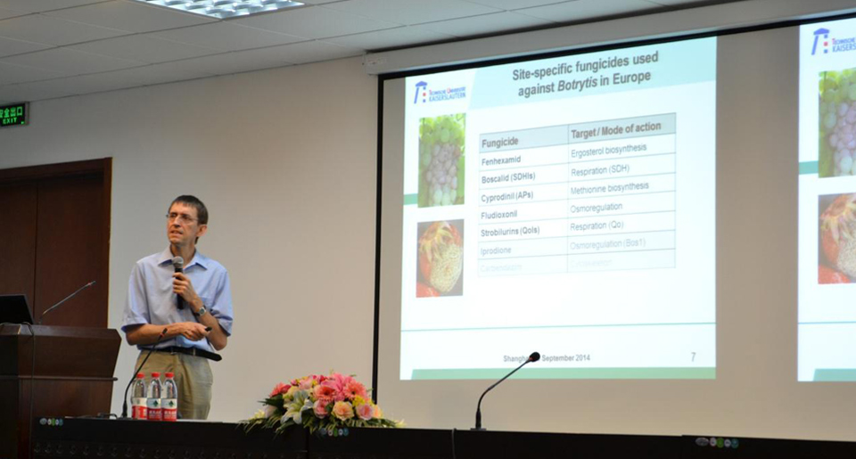 Hahn教授此次学术报告以"Fungicide resistance, genetic diversity and genomics of the grey mould fungus Botrytis"为题,阐述了近年来他的团队围绕重要的植物病原真菌--灰霉菌展开的一系列研究工作,从分子遗传学角度研究病原真菌多重抗药性(multiple fungicide resistance)的分子机理,发现真菌抗药性的改变是由于目标蛋白的构象发生改变、细胞膜上毒素转运体增多而导致的。此外,Hahn教授还带领其团队结合田间病害调查,利用多重抗药基因综合诊断技术对侵染草莓、树莓、葡萄和苹果等多种果蔬和花卉的灰霉菌菌株进行系统分类,为灰霉病的防治提供了重要依据,具有极高的应用价值。报告结束后,师生们与Hahn教授进行了热烈的讨论。最后Hahn教授还介绍了德国的经济、文化、教育、社会等风土人情,不仅使同学们在科研思路、科研方法上有所收获,同时也使同学们对德国文化有了一定的了解。