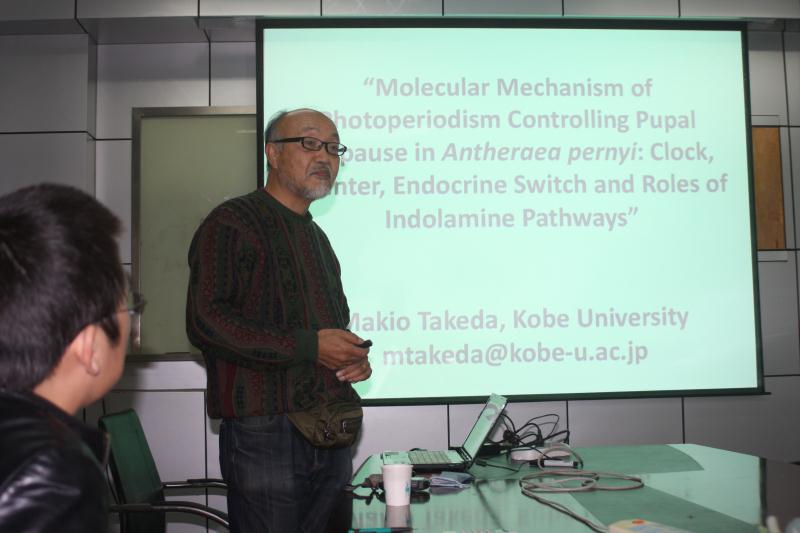 何祝清工程师邀请他的博士导师,日本神户大学的竹田真木生教授来院讲学,竹田真木生教授以“Molecular Mechanism of Photoperiodism Controlling Pupal Diapause in Antheraea pernyi: Clock, Counter, Endocrine Switch and Roles of Indolamine Pathways”(光周期控制柞蚕蛹滞育的分子机理:生物钟、应对反应、内分泌转换以及吲哚胺途径的作用)为题,为大家带来了一场精彩的学术讲座。讲座由何祝清工程师主持,何琳副教授和昆虫组以及其他实验室的研究生同学一同聆听了讲座。