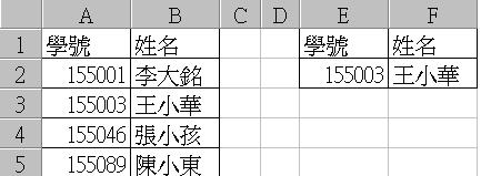 | 左边A2:B5为参照数组范围,E2为欲搜寻的值,传回数组表的欲对照的栏为第2栏(姓名) 在F2输入=VLOOKUP(E2,A2:B5,2,FALSE)将会找到155003是王小华,然后显示出来。 绝对参照=VLOOKUP(E2,A2:B5,2,FALSE) |