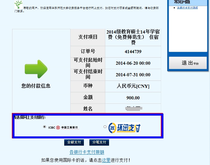 4.1选择蓝色框内的“支付银行”,然后付款。如使用工商银行卡,可选择“中国工商银行”通道,其他银行卡务必选择(环迅支付);如果所付金额超出所用卡的单笔支付限额,可点击“分笔支付”拆分后进行付款。