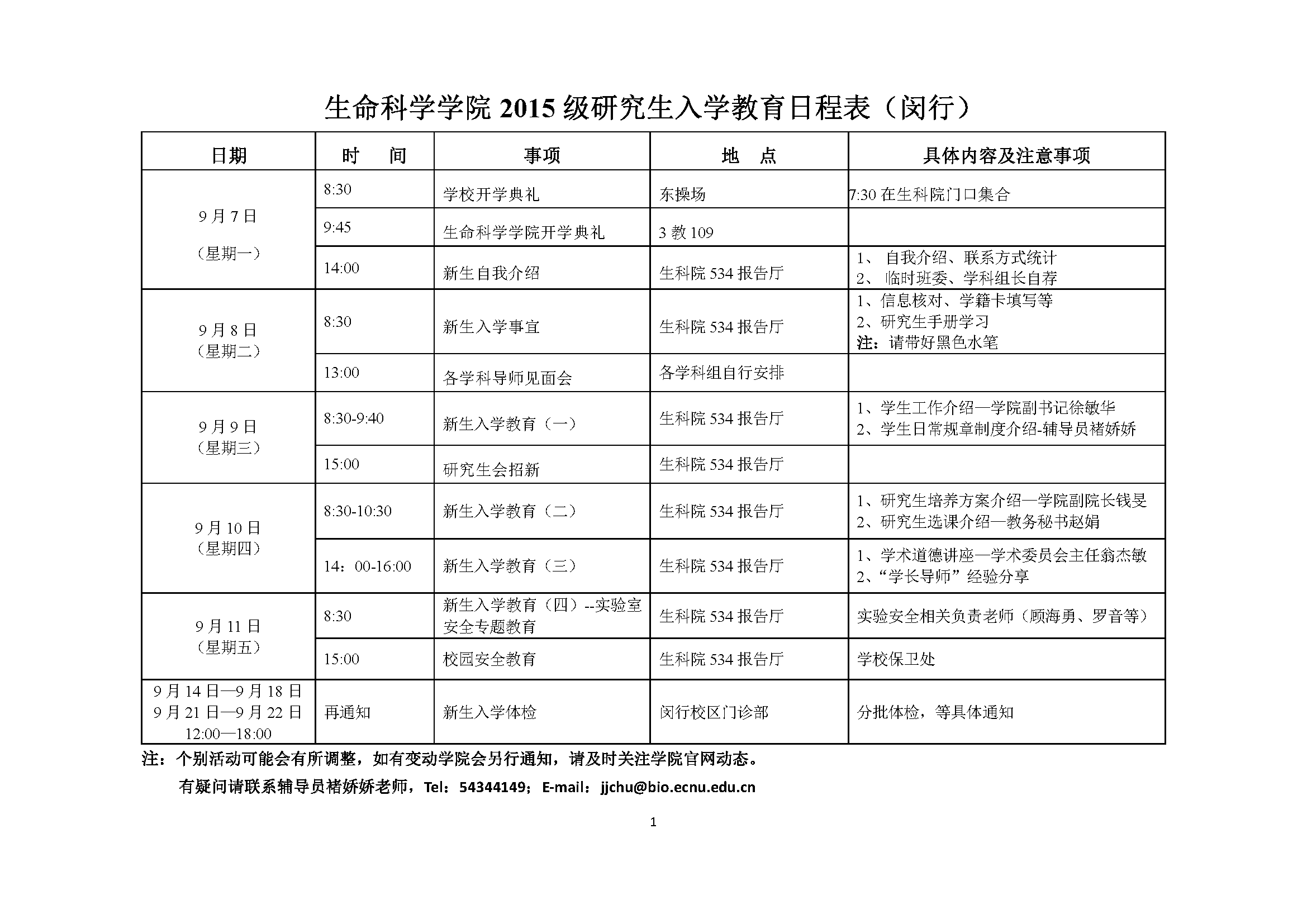 | 9月10日 | 8:30-10:30 | 新生入学培训(二) | 闵行--生科院534报告厅 | 1、研究生培养方案介绍—学院副院长钱旻 |