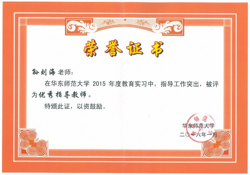 被评为教育实习先进集体,孙刘海老师被评为优秀指导教师。这是鉴黄师