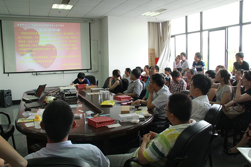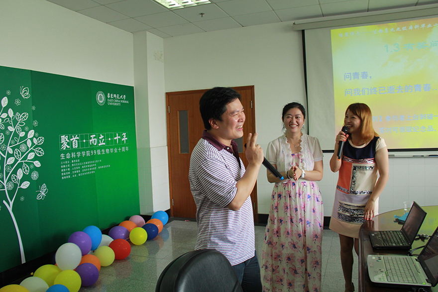 在毕业十周年联欢会上,同学们深情地回忆起那些年在师大校园里一起听过的课、做过的实验,并以“有奖问答”的形式,回味起当年在师大学习生活的点点滴滴,现场充满了浓浓的师大情缘。随后的分享活动中,校友们讲述了大家这十年来的工作和成长经历,并播放了远在美国进修和工作的两位同学发来的视频,宣读了辅导员张红锋老师特地发来的一段感人寄语,师生共同分享人生经验和感悟。之后的“猜猜他是谁”游戏中,根据校友写的小诗、校友子女的照片进行有奖竞猜,气氛十分热烈。在最后“展望未来”的环节中,留校工作的同学介绍了母校闵行新校区情况和未来发展目标及近期重点工作,与大家一同分享母校发展的喜悦。之后大家分别写下对今后十年的个人心愿和希望,到毕业二十周年聚会时再揭晓。联欢会在《相亲相爱一家人》的歌声中圆满结束。随后全体校友合影留念,共进晚餐。