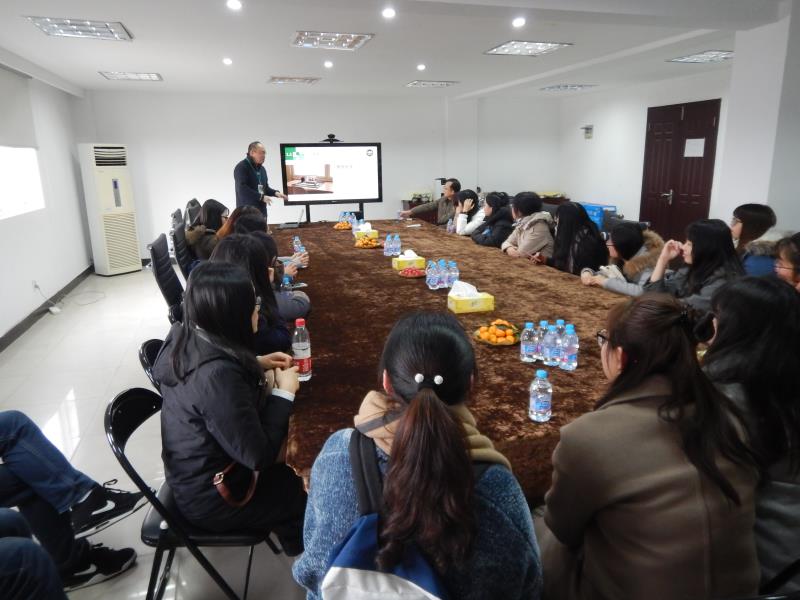 在接待室里,黄总监为同学们简要介绍了雅本化学的公司概况及生产范围。为了方便同学们对工厂车间进行参观,同时为了保障同学们的安全,工作人员为同学们播放了安全视频,并分发了门禁卡以及安全头盔。