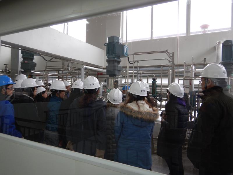 同学们首先对研发室进行了参观,研发室是工厂运作的核心区域,也是“发酵种子车间”所在之处。然后同学们对发酵车间进行了细致的参观,发酵车间里有大小不同的种子罐,以及更大规模的发酵罐,负责对微生物进行逐级放大培养。张厂长详细的介绍了发酵罐的灭菌和控制方法。随后顺着物料管道又参观了离心机等下游处理设备。
