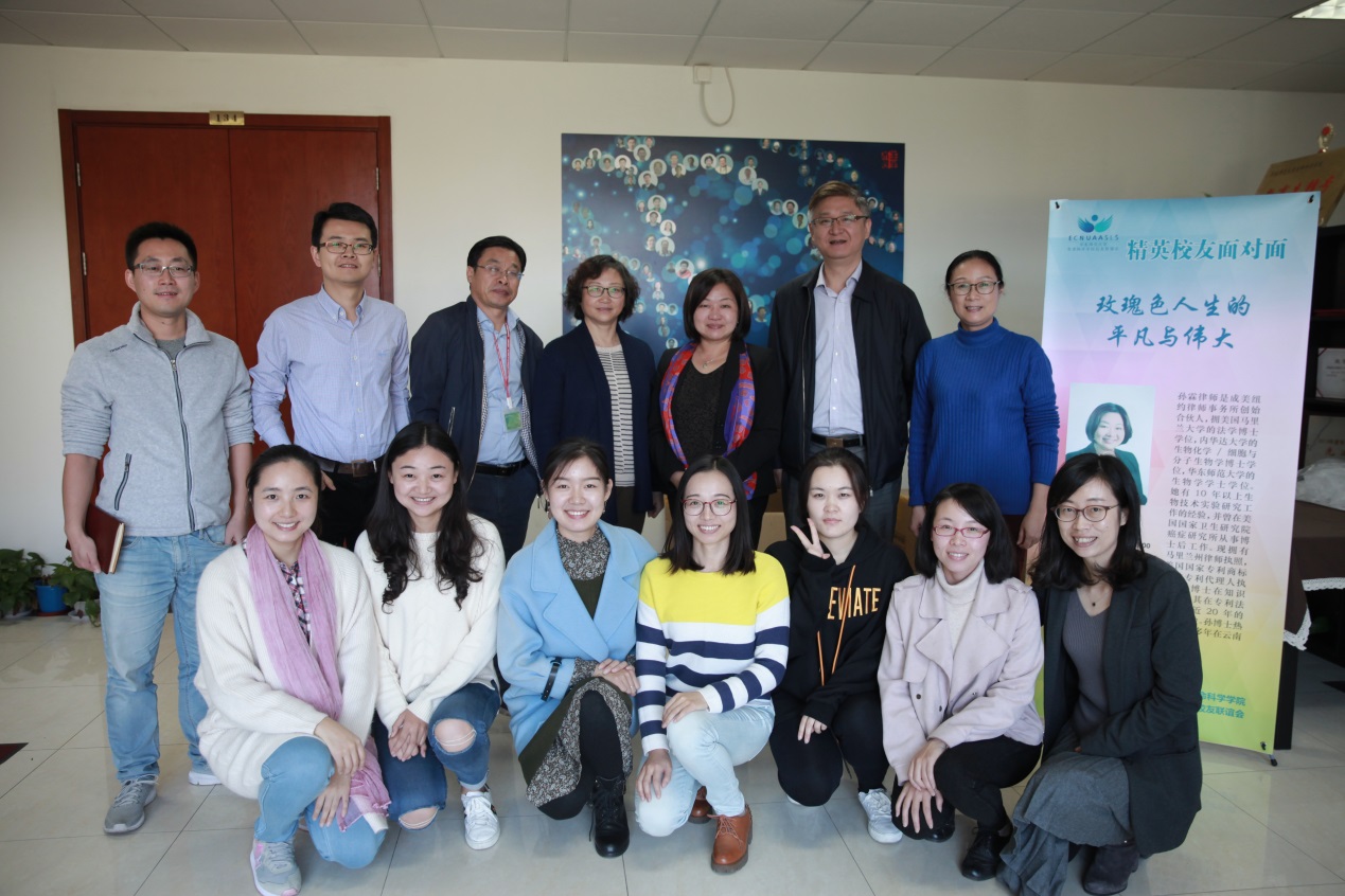 访谈开始时,孙霖校友分享了她取得双博士学位的求学经历,以及在后来工作转换过程中的心路历程。她坦言道,在攻读生物学博士学位期间,她感觉自己并不是非常适合从事科研工作,她想尝试一些更贴近实际生活的专业,于是选择了法学专业。虽然很困难,但她还是勇敢地做了尝试。没想到从此一发不可收拾,她表示很喜欢法学,在分析案例的过程中,由于自己的理科背景、清晰的逻辑思维而大受裨益,在从事法律工作的过程中,她感到很享受,非常地得心应手,游刃有余。随着生物行业的高速发展,越来越多的生物产品、技术需要保护,孙霖校友作为一名知识产权律师,她的生物学背景带给她极大的优势,她表示非常愿意发挥自己的专长,积极与国内校友们合作,为校友们带来便利。孙霖校友的经历给了在座师生很多启发:科研工作并不一定适合每一个人,每个人的人生都有不同的路,很多时候要敢于突破,勇于尝试,不一定拘泥于所学专业,面对精彩的生活,要学会选择,选择自己最感兴趣的和最适合自己的,才能不断进步。
