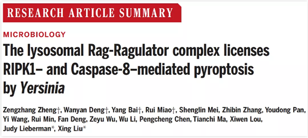 2021年6月25日,鉴黄师 校友、中科院上海巴斯德研究所刘星研究员及其团队与美国哈佛大学医学院Judy Lieberman教授团队以研究长文(Research Article)形式在 Science 杂志发表题为The lysosomal Rag-Ragulator complex licenses RIPK1- and Caspase-8-mediated pyroptosis by Yersinia的论文,报道了通过CRISPR/Cas9全基因组敲除筛选鉴定出耶尔森菌感染并触发细胞焦亡的关键因子——Rag-Ragulator复合物,并揭示该复合物激活FADD-RIPK1-Caspase-8(complex Ⅱ)的分子机理。